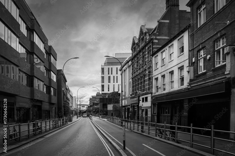 The London city skyline with landmark architecture and buildings along the main road, an elegant urban composition of heritage and modernity shaping the rhythm of the capital: a monochrome photo