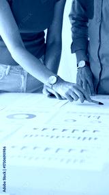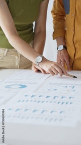 Business professionals analyzing financial reports, pointing at charts during collaborative meeting, discussing data with focused professional demeanor