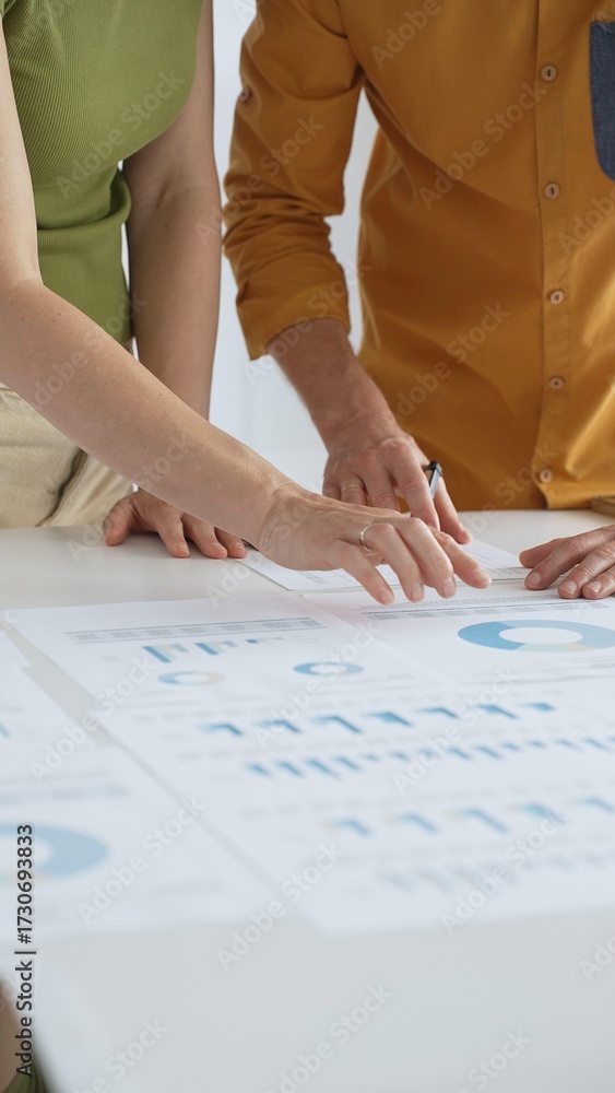 Professional team collaborating, reviewing financial documents and graphs on laptop with printed data spread across conference table in contemporary workspace. Business people concept