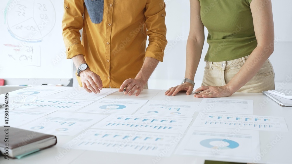 Business team members are reviewing financial data, analyzing charts and graphs, during a productive meeting in a modern office space