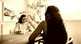 Two professional women discussing architectural plans in a bright modern office space