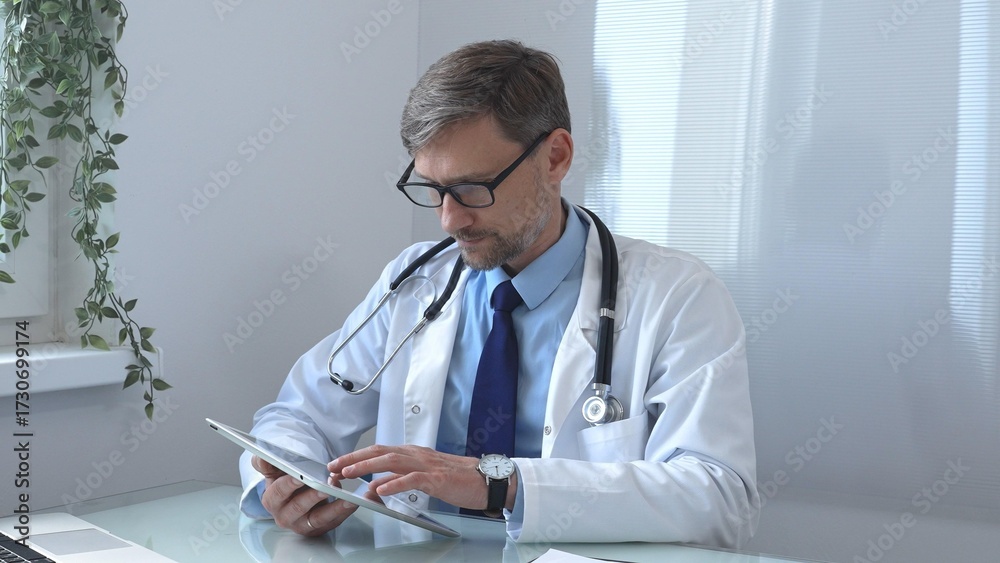 Medical doctor wearing lab coat and stethoscope using digital tablet consulting patient data in bright medical office with laptop next to him. Medicine and health care