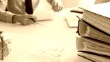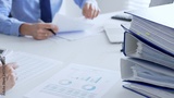Corporate professionals reviewing financial documents, working collaboratively at white desk with blue folder stack, highlighting teamwork and business productivity. Audit and taxes in business