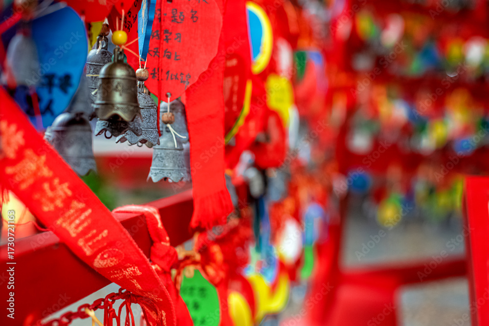 Carved bronze bells and red ribbons with Chinese characters at a temple.