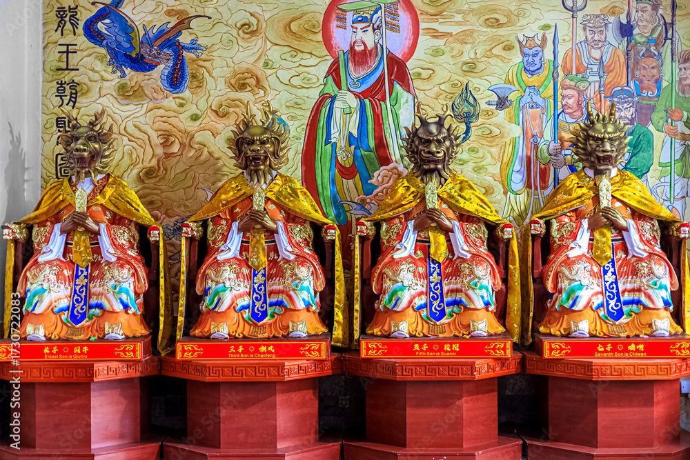 Golden dragon-headed statues in colorful ceremonial robes. Nianshan Park, Sanya, China. March 1, 2024.