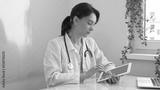 Female doctor wearing lab coat and stethoscope using digital tablet while sitting at desk in medical office, browsing patient information or conducting online consultation. Medicine concept