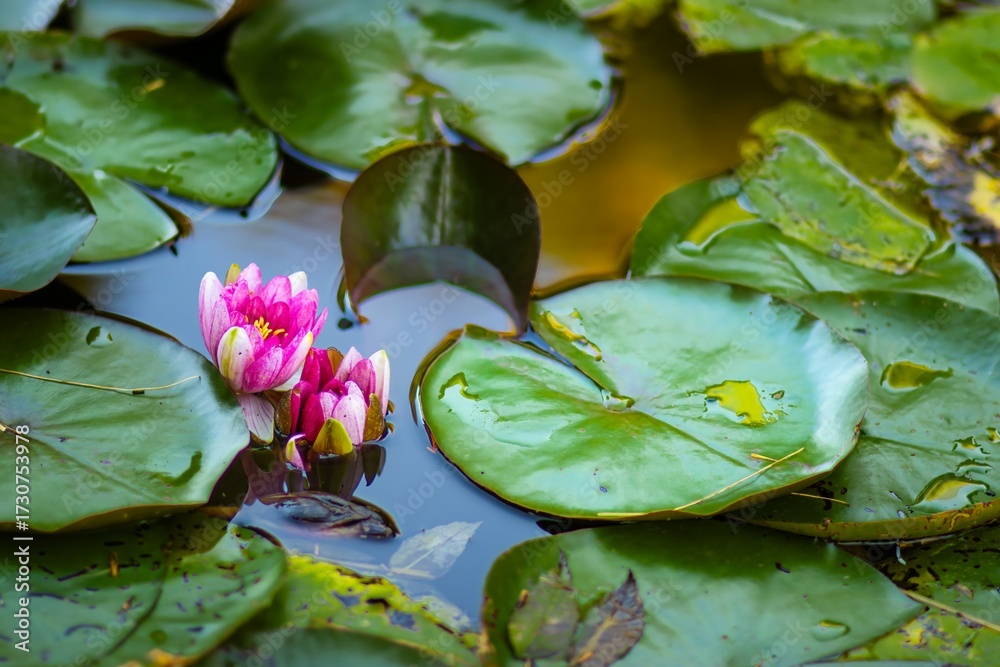 Vibrant pink water lilies bloom amidst lush green lily pads on tranquil water surface, creating a serene and peaceful natural environment for relaxation and reflection