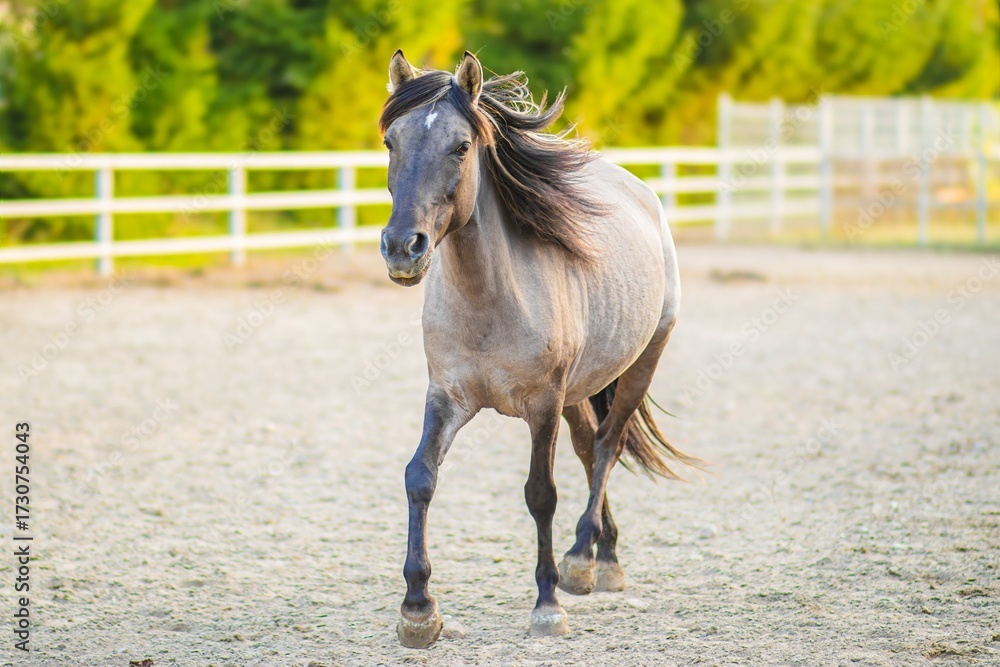 Majestic gray horse galloping gracefully in a sunlit arena, showcasing its powerful physique and flowing mane, surrounded by lush greenery and a wooden fence