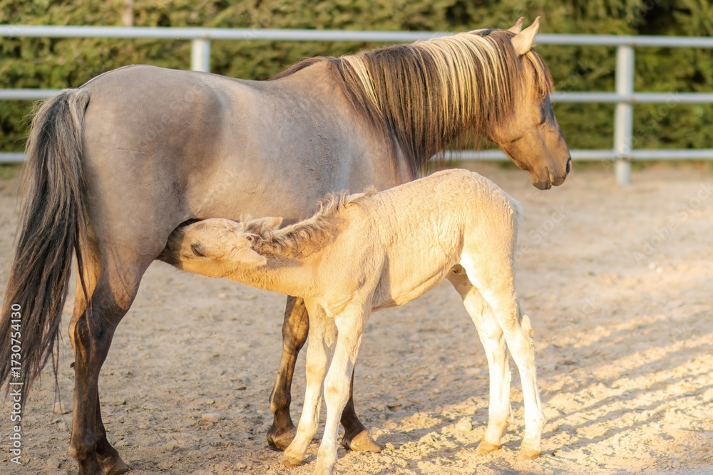 Young foal nursing from its mother in a sunny stable environment, showcasing the bond between mare and offspring in a natural setting with soft lighting