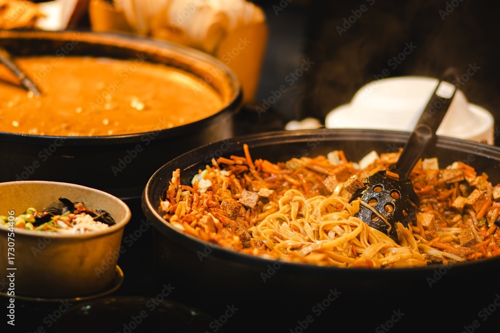 Delicious Asian noodle dish being served in a large black bowl, with steaming vegetables and sauces in the background, showcasing vibrant culinary presentation and textures