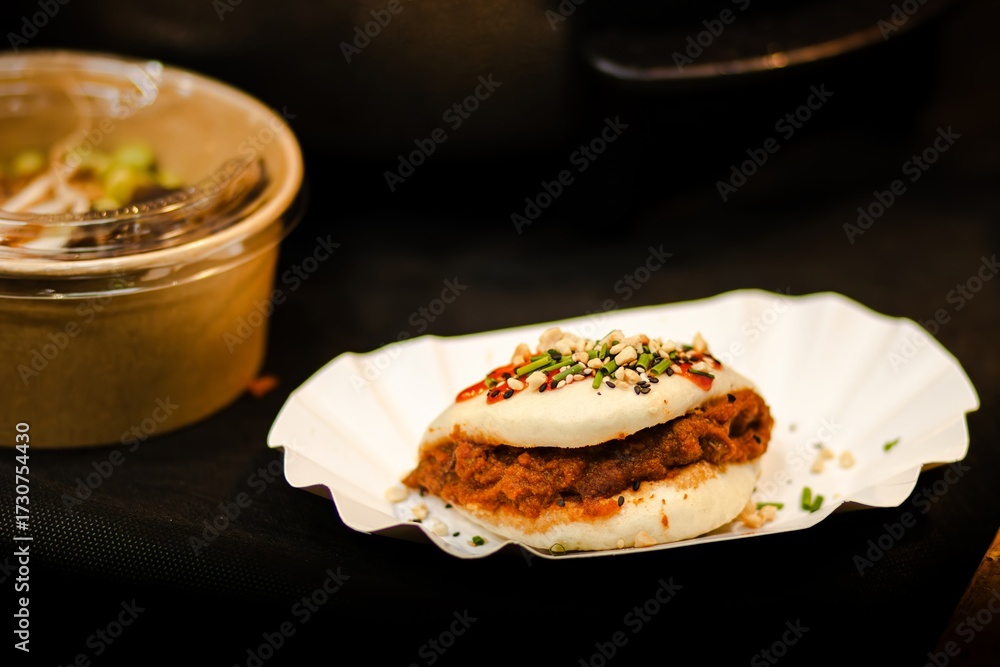 Delicious Asian-style steamed bun filled with savory meat, garnished with sesame seeds and chili sauce, served alongside a container of fresh noodles in a vibrant food setting