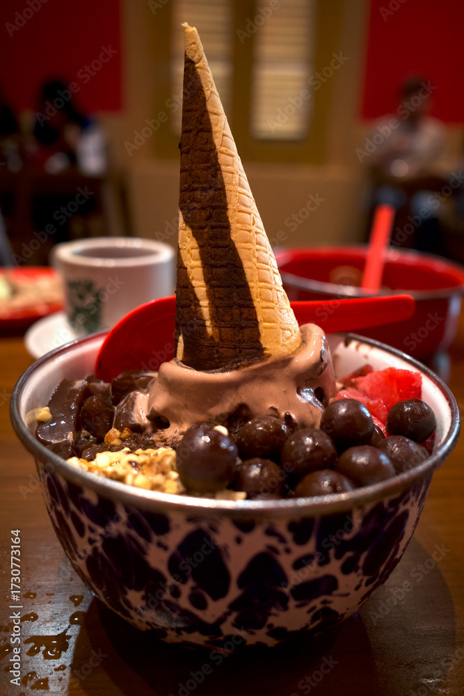 Ice cream in a classic bowl with a cone garnish, chocolate balls, nuts, pudding and watermelon, on a wooden table