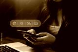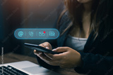 Businesswoman using smartphone with digital contact icons, representing communication, email, messaging, customer support, online service, digital marketing, and business connectivity.