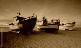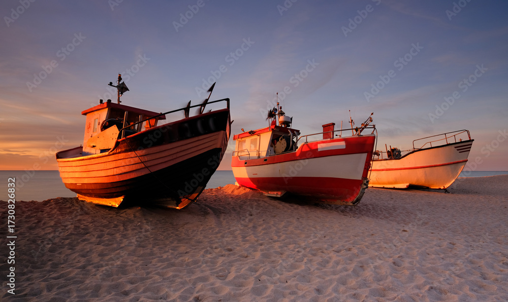 Łódz rybacka na bałtyckiej plaży w pięknych barwach zachodzącego słońca