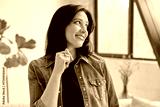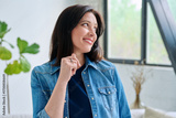 Headshot profile portrait of smiling woman 30 years old inside room at home