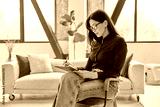 Portrait of serious business woman with clipboard sitting in chair, in office