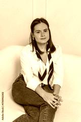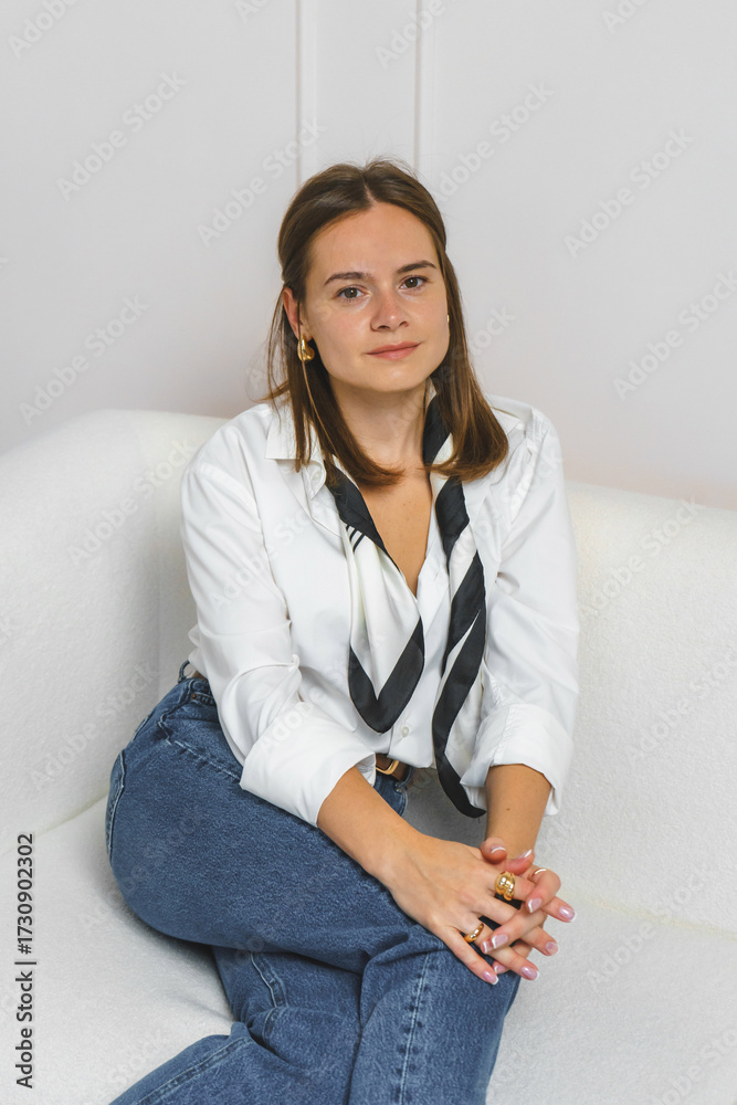 A modern businesswoman in a white shirt, blue jeans and a scarf sits on a sofa