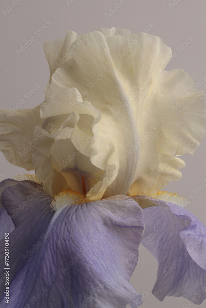 Close-up cream beige, lilac, violet Iris Flower bud petals on gray. Natural macro art background.