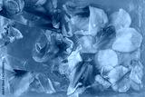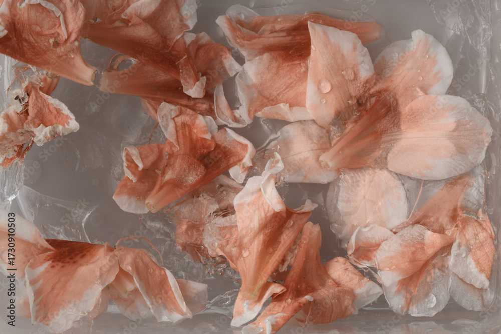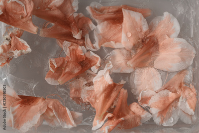 Soft focus beige mocha flower petal, leaf in frozen ice with water drops Abstract natural blur wet background.
