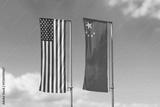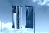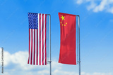 United States and China national flags waving on tall poles against blue sky, international relations and diplomacy concept.