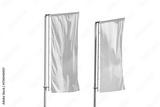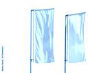 Two tall vertical white advertising flags on metal poles isolated on white background, mockup template for branding or event promotion.