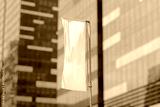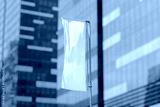 White vertical advertising flag waving on pole in front of modern glass building, outdoor corporate branding and business promotion concept.