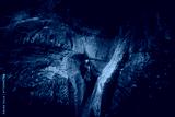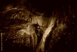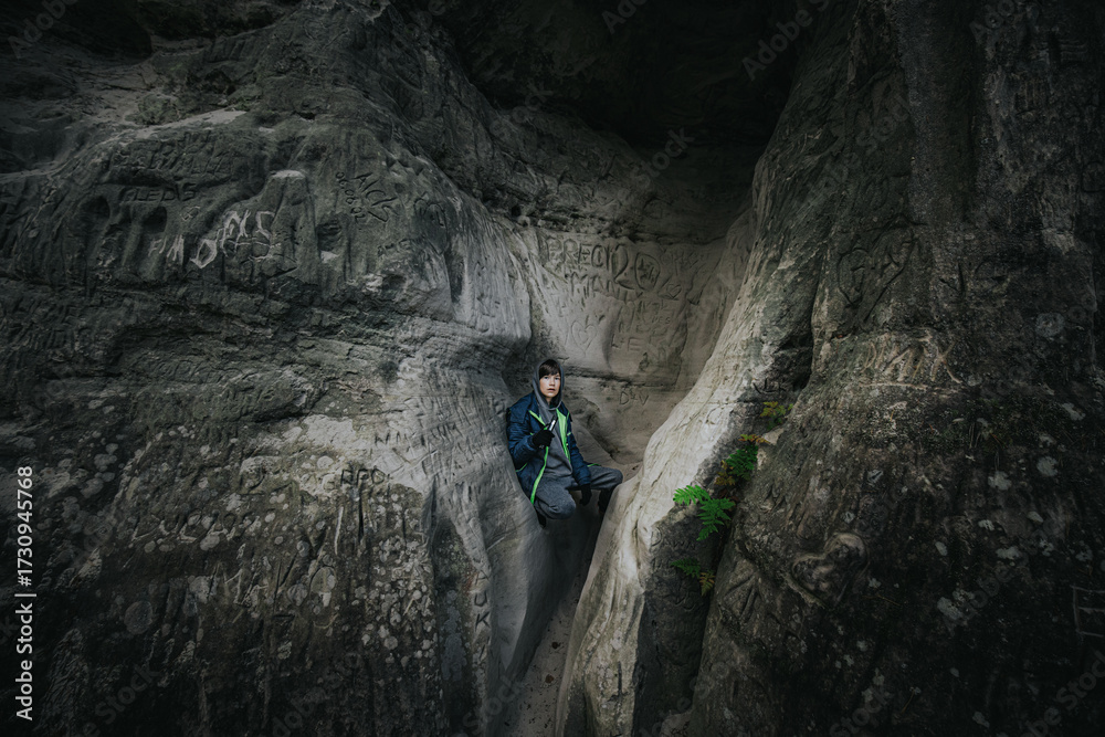 A boy in a hooded jacket sits in a narrow rock crevice covered with carvings and graffiti in a shadowy forest canyon.