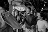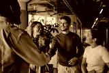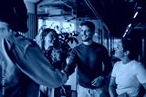 Diverse business professionals smiling, shaking hands, and networking in a modern corporate office environment