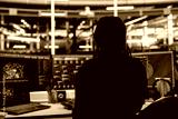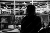 Data center technician uses AI visualization tool on computer to oversee automated repetitive tasks. Worker adapting server systems based on data analytics graphs using desktop PC