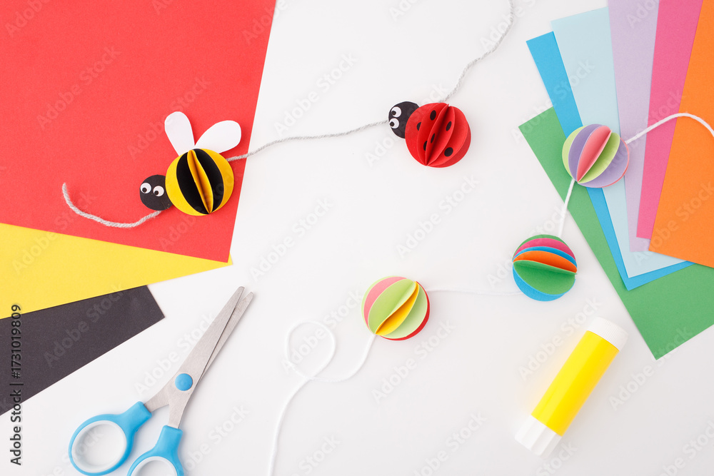 Bee and ladybug paper craft flat lay on blue background with tools and colorful sheets. Perfect for kids DIY education, creative workshops, craft blogs, school projects, children events,