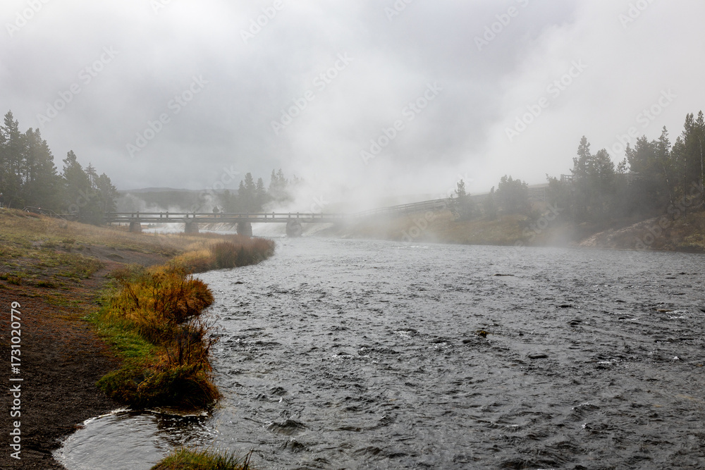 Serene river flows under a wooden bridge amidst misty landscape, evoking tranquility and the beauty of nature's quiet moments in a peaceful setting