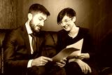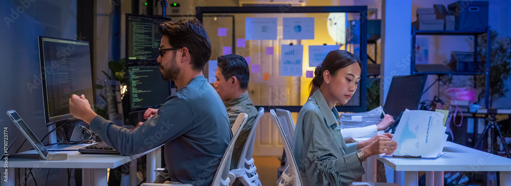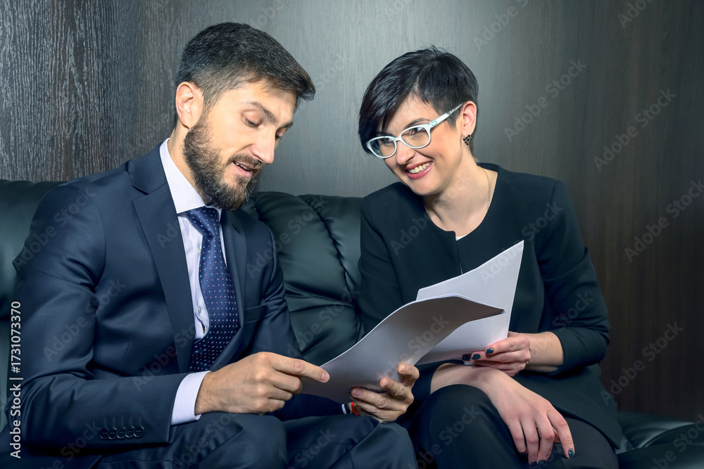 Business professionals discuss documents while seated on a couch in a modern office setting during daytime
