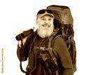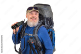 Experienced hiker ready for adventure with large backpack and binoculars in outdoor setting