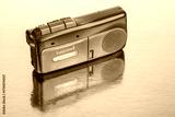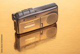 Vintage tape recorder on reflective surface showcasing sound technology from the past