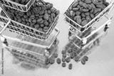 Coffee beans stacked in shopping carts on a shiny gold surface during daylight