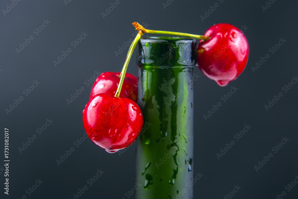 Fresh cherries resting on a green bottle with drops of water in a dark background