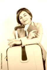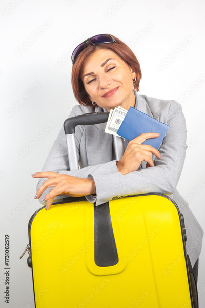 Woman with suitcase and passport excited for travel adventures ahead