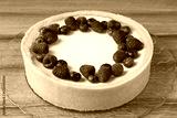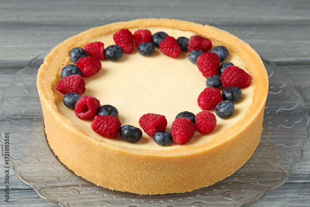 Delicious cheesecake with fresh berries on grey wooden table, closeup