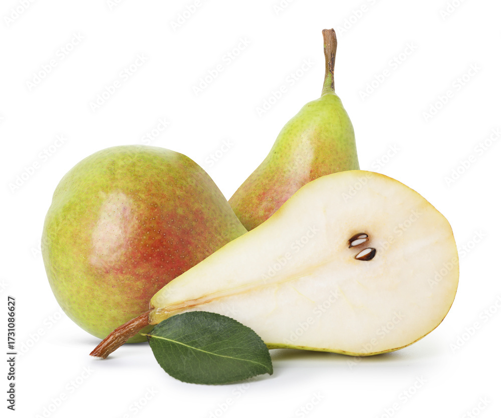 Fresh sweet pears isolated on white. Whole and sliced
