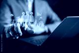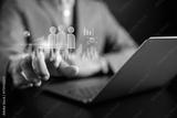 Corporate management with digital analytics, team and business data charts, representing strategy planning, human resources, decisions and organizational development.