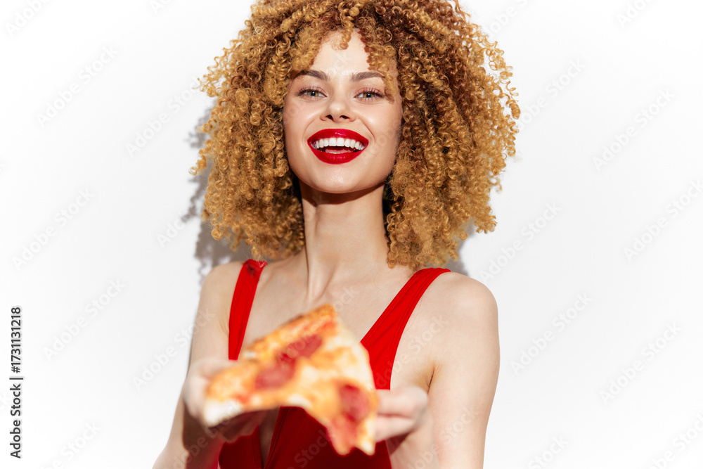 Young woman with curly hair holding a slice of pizza, wearing a vibrant red outfit, smiling joyfully against a white background, representing a fun and indulgent eating experience