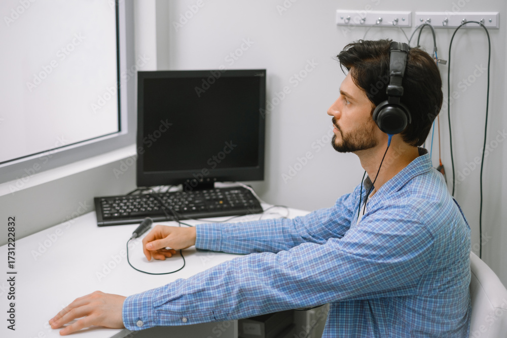 Young man in audiology booth wearing headphones and pressing response button during hearing evaluation in clinic