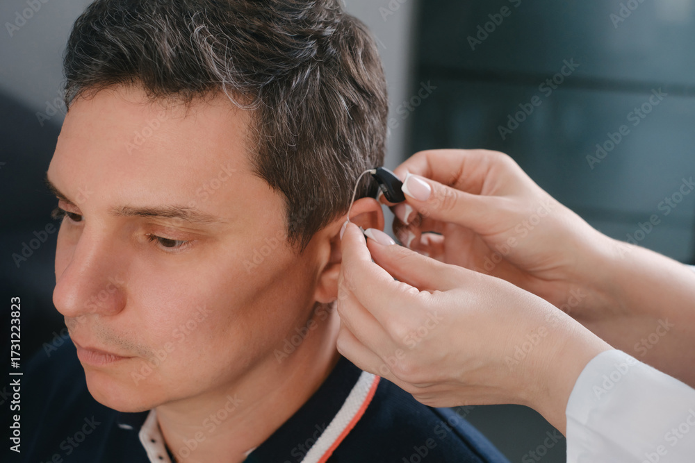 Audiologist fitting a behind-the-ear hearing aid for a man in his 40s during clinic visit. Modern small hearing device adjustment and personalized care in audiology practice