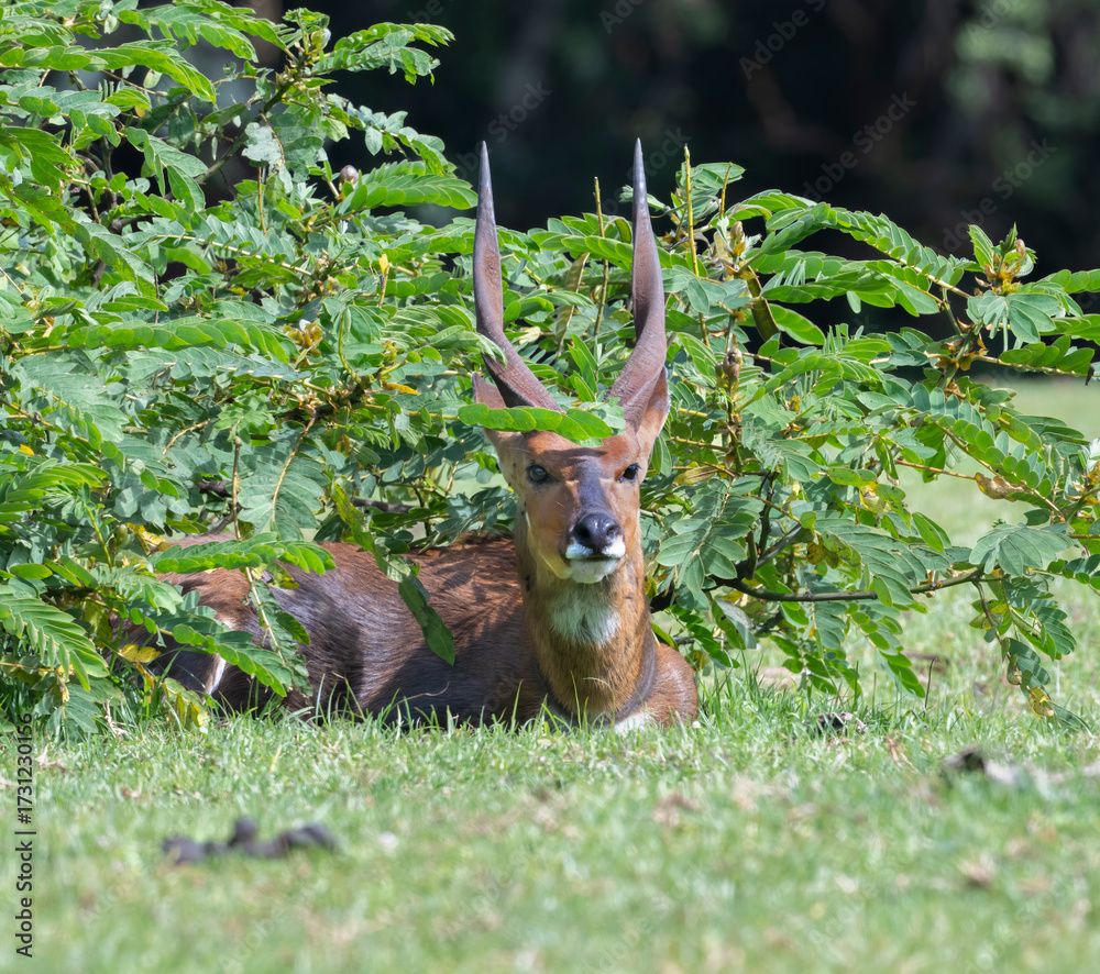 Male Cape bushbuck (Tragelaphus sylvaticus), Hiding in Bush, Mount Elgon, Kenya