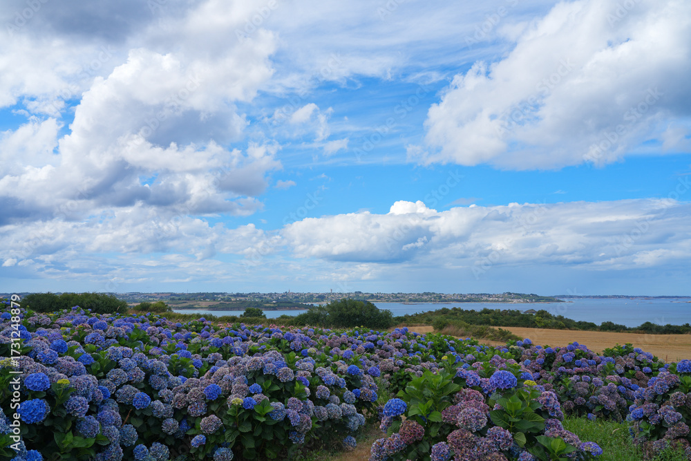 View of an hydrangea nursery sloping towards the Atlantic Ocean in Paimpol, Britanny