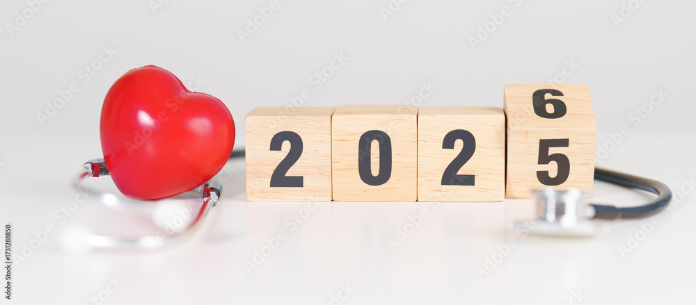2025 end year to Happy New Year 2026 with Stethoscope of doctor and heart shape on table. health care, Insurance, Wellness and medical concepts