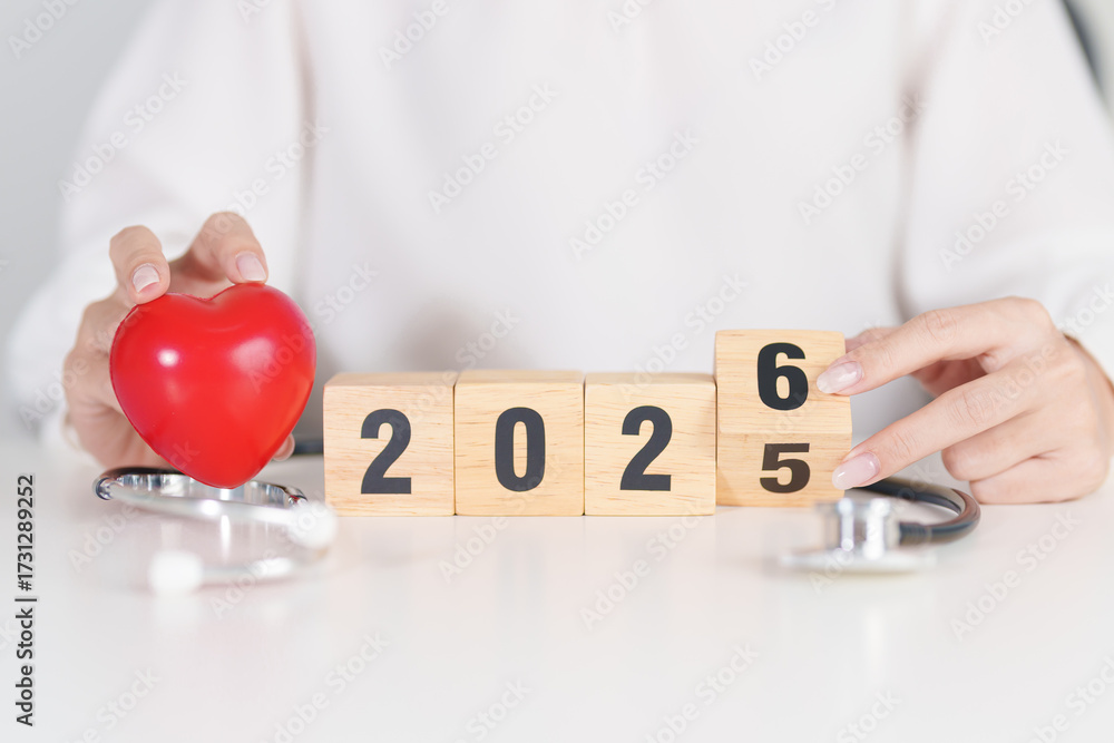 2025 end year to Happy New Year 2026 with Stethoscope of doctor and heart shape on table. health care, Insurance, Wellness and medical concepts
