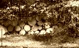 Wooden logs stacked neatly in a forest clearing surrounded by greenery and sunlight