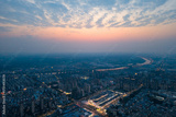 Suizhou City, Hubei Province, China cityscape glows under twilight skies showing urban expansion and river views.