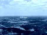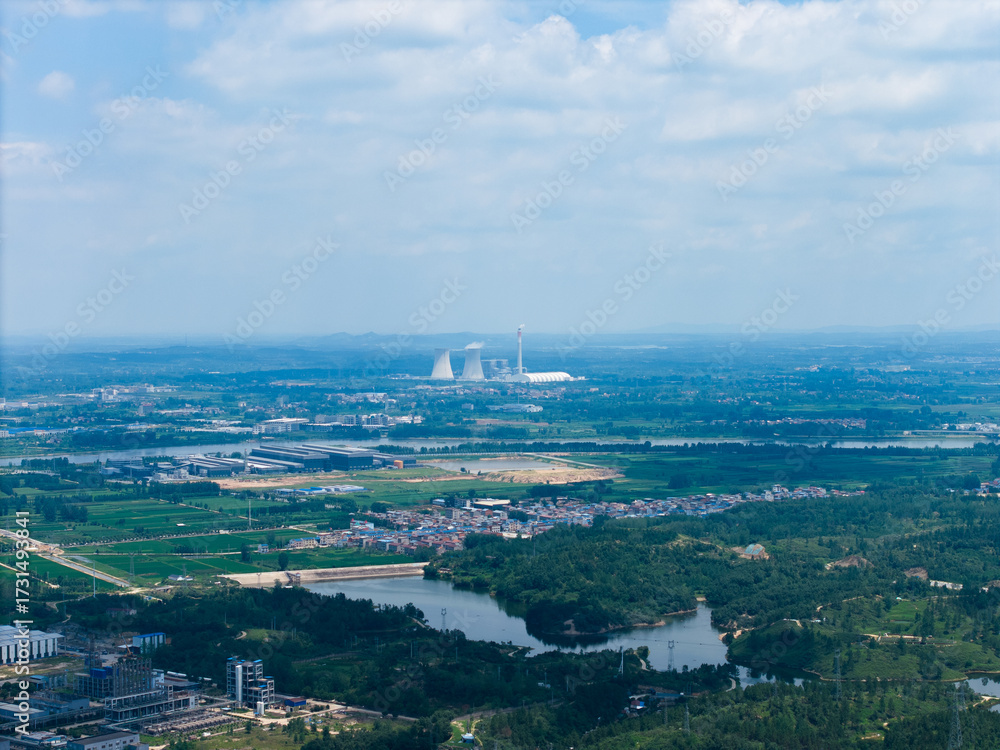 Suizhou City Hubei Province China landscape with industrial cooling towers visible in the distance under a cloudy sky.